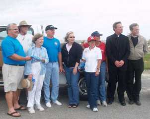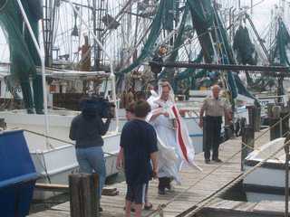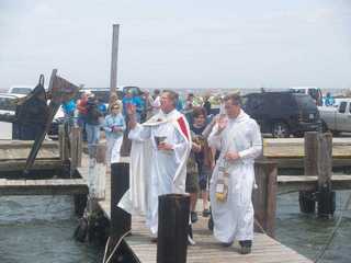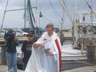 More Photos by Ron Daley on a Cloudy, Windy Sunday when the boats and crafts stayed in the Harbor to be blessed by Fathers Dennis Carver of St Paul and Chris Colby of Trinity. On hand were Blessing Co-chairmen Chipper Mc Dermott and Trey Campbell in addtion to other on-lookers with the Doussans.